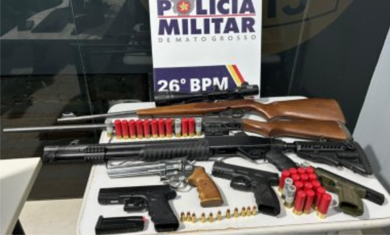 O homem foi localizado e detido dentro da própria residência. Durante buscas no local, os policiais apreenderam duas espingardas, uma pistola, um rifle, um revólver, uma arma airsoft e 32 munições de diferentes calibres. O suspeito confessou possuir registro de Caçador, Atirador e Colecionador (CAC) e afirmou que as armas eram registradas.