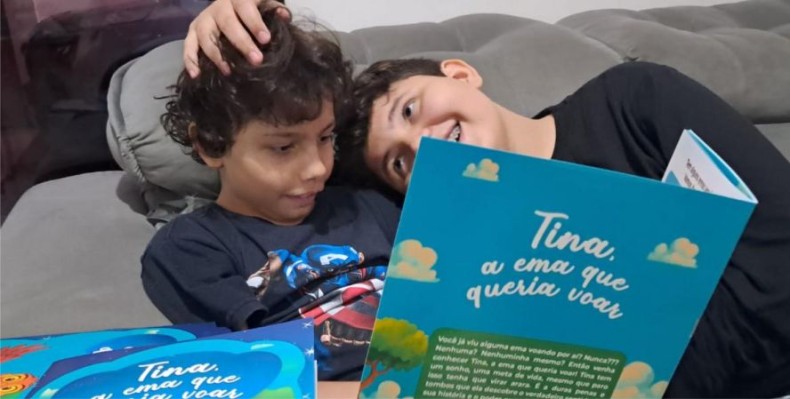 Uma ema que quer voar! Cortar o ar com suas grandes asas e deixar um rastro no céu em meio às araras. Mas isso seria possível? É o que você vai descobrir ao ler “Tina, a ema que queria voar” escrito por três pares de mãos com criação da jornalista Claudia Lazarotto e os filhos Vicente Lazarotto Santos, 07 anos, e Lino Joaquim Lazarotto Santos, 11 anos de idade. O livro, que traz o sonho de Tina e também um pouco de sua rebeldia diante do mundo, será lançado no dia 17 de abril, às 19h30, na Praça da Juventude.