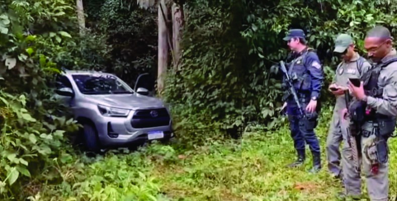Em uma área de mata, os policiais conseguiram recuperar notebooks levados da vítima. Pouco tempo depois, com apoio do helicóptero do CIOPAER, a caminhonete também foi localizada, escondida em meio à vegetação nas proximidades do Rio Teles Pires, em uma área de difícil acesso.