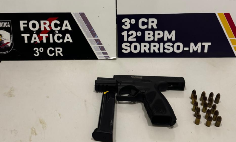 Ao aprofundar os procedimentos, os policiais realizaram busca pessoal e localizaram uma pistola calibre 9mm, da marca Taurus, modelo TS9, acompanhada de 18 munições intactas e um carregador. A presença do armamento, sem autorização legal, agravou a ocorrência.
