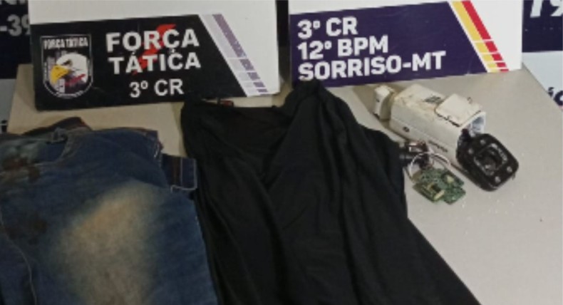 A câmera danificada foi recuperada pelas equipes, juntamente com as roupas utilizadas pelos suspeitos no momento da ação. O detido foi encaminhado à delegacia e permanece à disposição da Justiça.