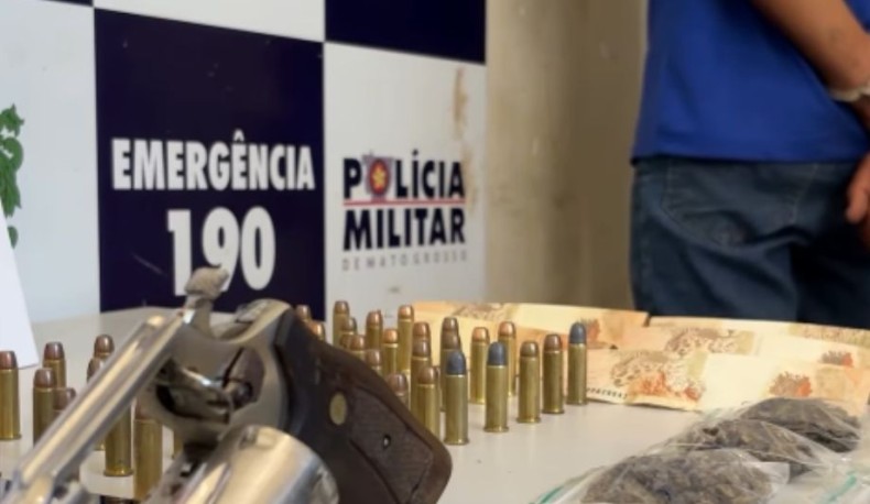 Um jovem de 21 anos foi preso pela Polícia Militar durante patrulhamento no bairro Mário Raiter, em Sorriso, após ser flagrado com arma de fogo, munições e entorpecentes.