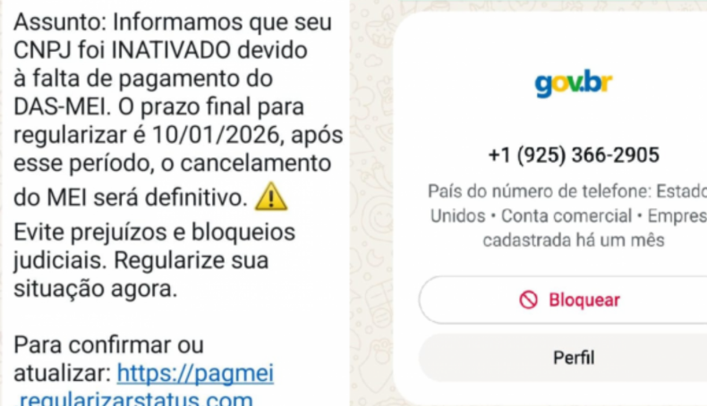 O início do ano, período tradicional de organização financeira e regularização de atividades, tem sido aproveitado por golpistas para enganar microempreendedores individuais (MEIs). Mensagens enviadas via WhatsApp, a partir de um perfil falso com imagem e identidade visual semelhantes ao gov.br, informam que o CNPJ do empresário estaria suspenso e direcionam a um link de pagamento para suposta regularização. Trata-se de golpe.