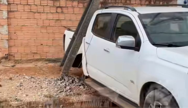 Com o impacto, a caminhonete sofreu danos significativos, chegando a perder uma das rodas, enquanto o poste ficou completamente entortado. Marcas da colisão ficaram espalhadas pela via, chamando a atenção de moradores e motoristas que passavam pelo local. Equipes do Corpo de Bombeiros foram acionadas para atender a ocorrência.
